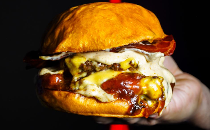 Carne de vaca gallega madurada 30 días rellena con queso americano, una mermelada de panceta y cebolla caramelizada, coronada al final con más queso americano, salsa mayo bacon (nueva receta) y una loncha de bacon crujiente para una doble textura