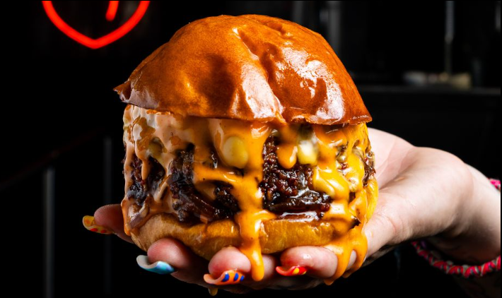 Carne de vaca gallega madurada, rellena con queso cheddar, cebolla caramelizada durante 4 horas en una reducción de soja SHODA y bacón frito triturado a bits, coronada con más queso cheddar original y salsa Emily un poco picante. Con 200 g aprox. de patatas gajo o palo.